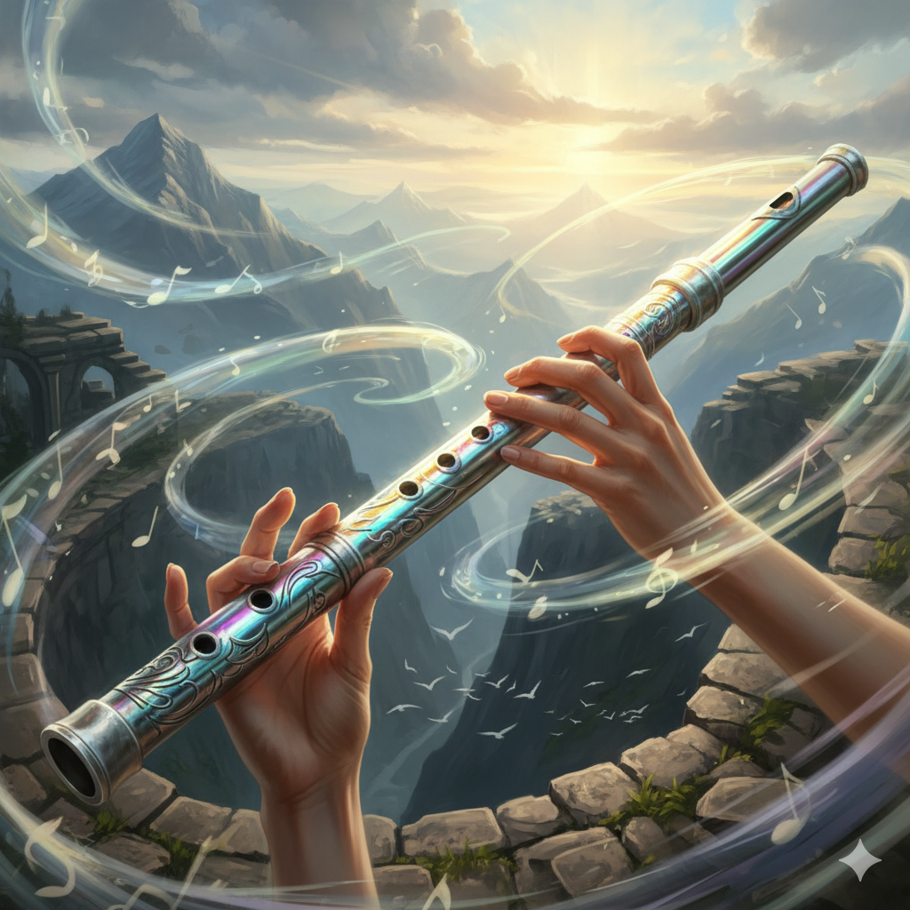 A Szelek Fuvolája egy ezüstösen csillogó, légies mintákkal gravírozott hangszer, amely szivárványos fényben villan fel, ha napfény vagy holdfény éri. A fuvola hangja nem csupán zene — a szél nyelve, amely képes megnyugtatni, elűzni, felemelni vagy megtéveszteni. Csak az képes megszólaltatni, aki tiszteli a szél szabadságát, és nem akarja uralni, csak együtt rezegni vele.
