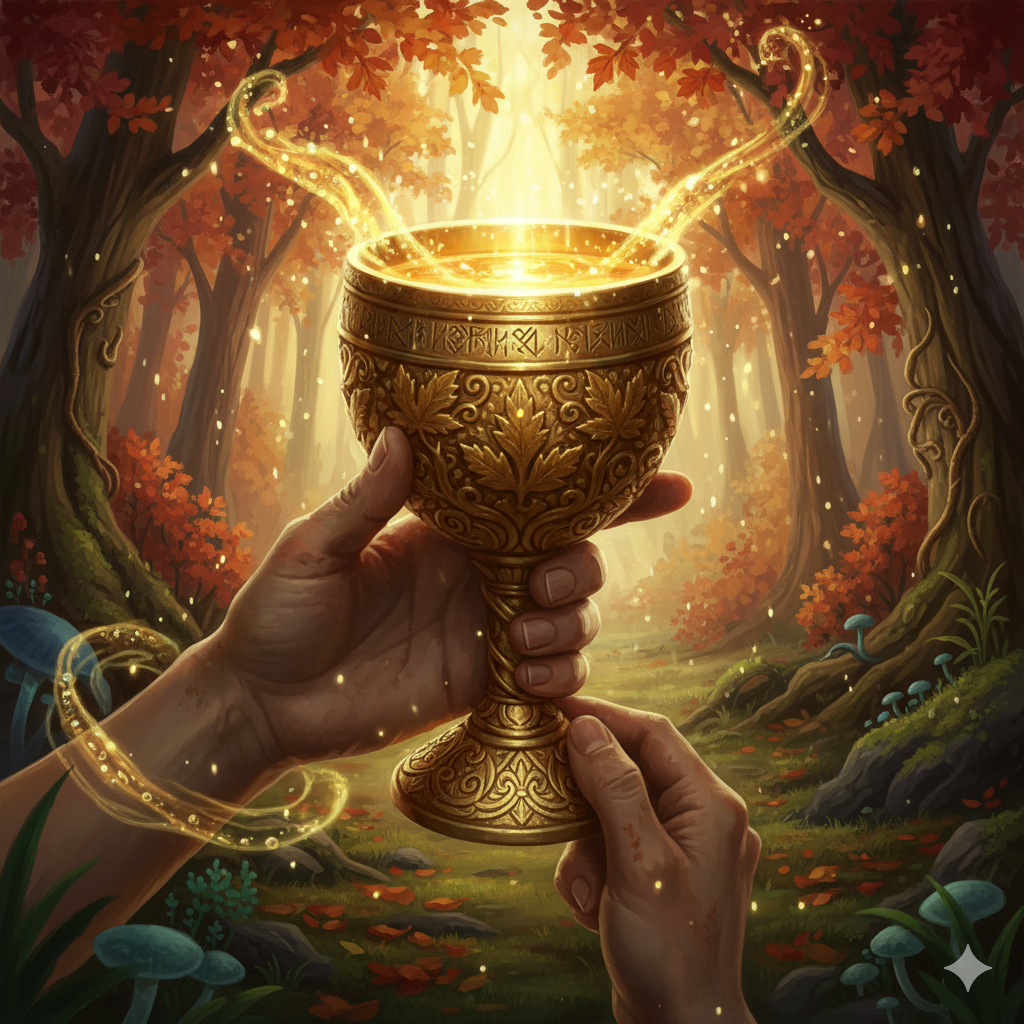 A Bőség Grálja egy aranyszínű, finoman faragott kehely, melynek peremén levélminták futnak, és belsejében a napfény mindig megcsillan, még sötétben is. Ha harmatot vagy esővizet gyűjtenek bele, az elixírré alakul — nem varázslat által, hanem a természet válaszreakciójaként. A Grál nem eszköz, hanem kapcsolat az ősz esszenciájával, a napfény bölcsességével és a természet szívverésével.