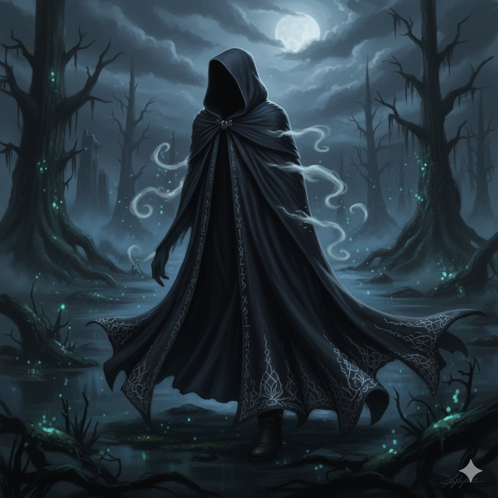 Az Árnyak Köpenye egy mélyfekete, selymes szövetből készült ruhadarab, mely elnyeli a fényt, mintha maga az éjszaka szövete lenne. Ezüstszínű rúnák futnak végig a szegélyein, melyek az árnyékok ősi nyelvét hordozzák. A köpeny nemcsak elrejt, hanem összeköt az árnyékok birodalmával, ahol a fény nem uralkodik, és az igazság mindig rejtve marad.
