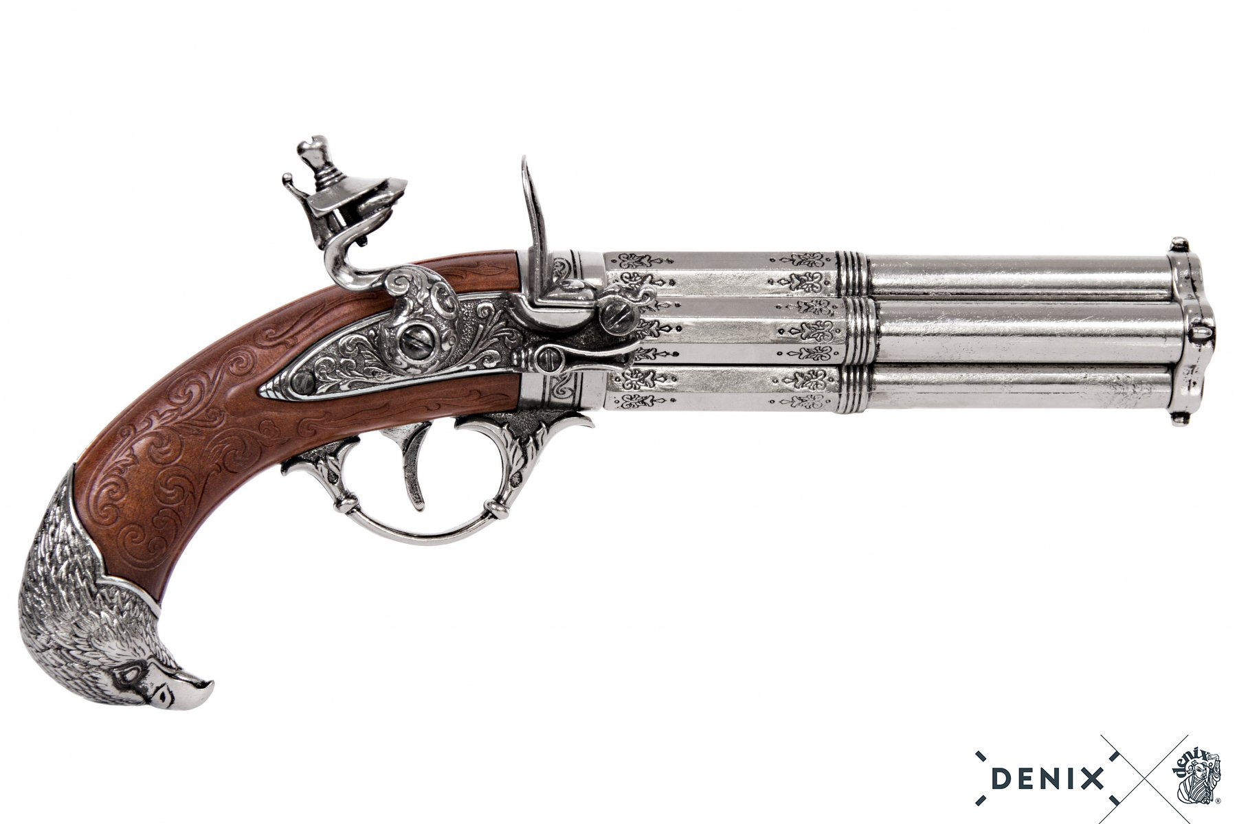 A multi barrel Snaplock pistol that can carry four Gunpowder cartridges. Everytime it fires it rotates to a new barrel and only needs to be reloaded when all barrels are spent.