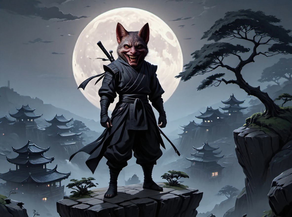 A stealthy warrior with a demonic fox face, dressed in shades of grey and black, and armed with hooked blades and shuriken.