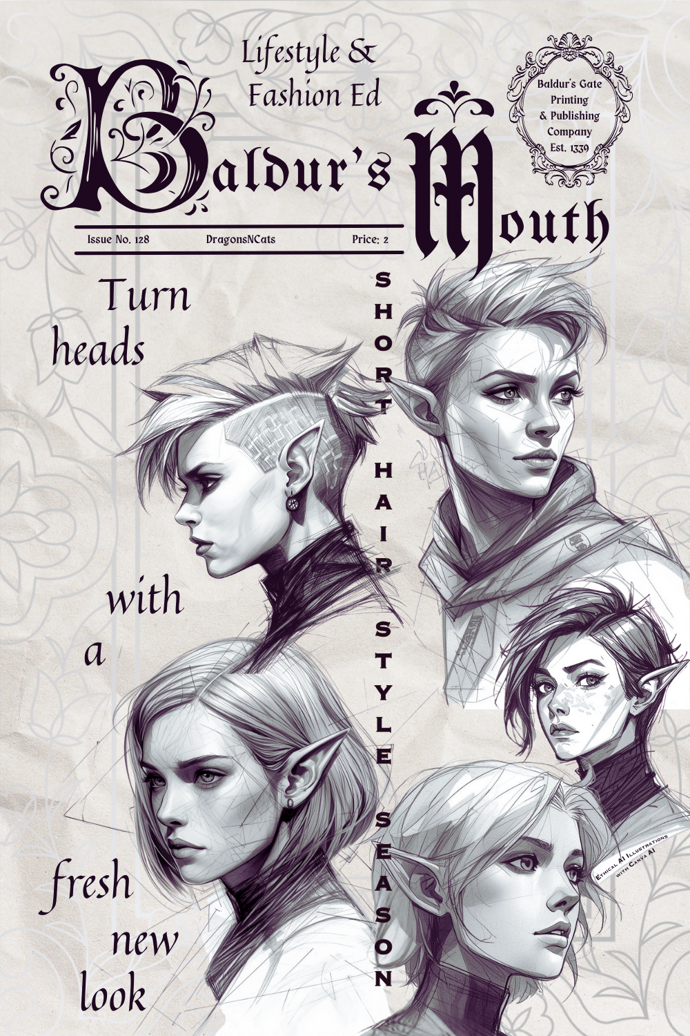 One of the graphic design trends for 2026 is Modern Medieval (or Future Medieval, Neo-Romantic Aesthetic) and I was inspired to try something similar. The illustrations were generated with Canva AI, and the rest of the design was done in Canva proper with creator assets. I wanted to do a newspaper spread, then the design template for a magazine caught my eye. Then I thought to myself, what if the Baldur's Mouth put out a Fashion Edition? By the time I was done with it, it looked nothing like the original template.