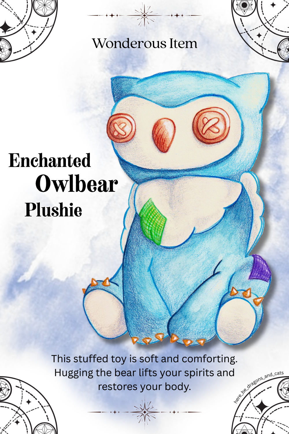 During my latest playthrough in preparation for Act 3 I was eyeing the Owlbear plushie that you can pick up throughout the game and I amused myself by creating a Wonderous Item featuring the plushie. Now, I consider my art skills serviceable, especially regarding things with big blobby bodies (like plushies) - but I'm still struggling with perspective of more complicated subjects and if you throw in foreshortening then my brain simply breaks.
